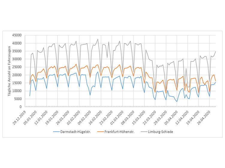 Das HLNUG misst in Hessen an drei Standorten das Verkehrsaufkommen: Limburg-Schiede, Darmstadt-Hügelstraße und Frankfurt-Höhenstraße. Das tägliche Verkehrsaufkommen ist ab Montag, 16. März 2020 Tag für Tag zurückgegangen. Mit Verschärfung des Kontaktverbots am Montag, 23. März 2020 gab es einen weiteren deutlichen Rückgang des Straßenverkehrs. Danach schwanken die Werte auf niedrigem Niveau beziehungsweise nehmen wieder leicht zu.
