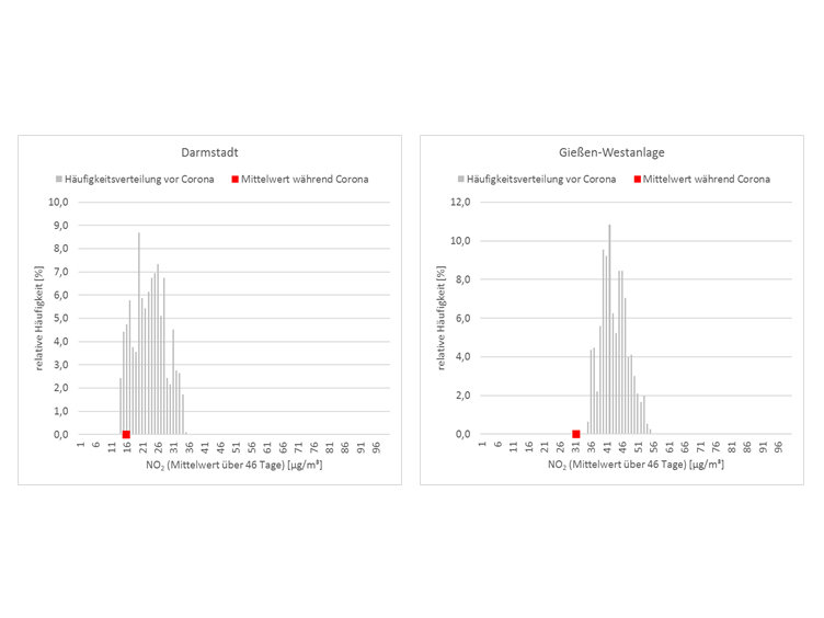 In Hessen gibt es bereits zwei Beispiele, anhand derer man beobachten kann, wie sich reduzierter Verkehr beziehungsweise Fahrverbote auf die NO2-Konzentration über einen langen Zeitraum auswirken: die Dieselfahrverbote in Darmstadt und die Sperrung des Frankfurter Mainkais. Hier liegen Messdaten über viele Monate vor, in denen verschiedene meteorologische Verhältnisse auftraten. Ein Vergleich von Mittelwerten ist hier demzufolge robust und zeigt in beiden Fällen eine deutliche Abnahme der NO2-Konzentration seit dem Beginn der Maßnahmen.