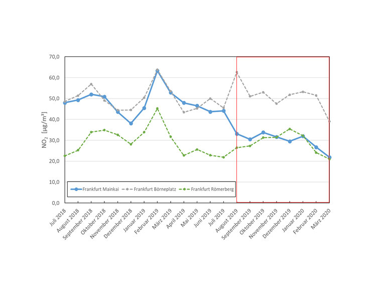 Die Stadt Frankfurt beschloss einen stark befahrenen Straßenabschnitt des Mainkais, in der Nähe der Innenstadt, für ein Jahr zu schließen. Die Sperrung begann im August 2019 und dauert zurzeit noch an. Bereits ein Jahr vor Beginn der Straßenschließung wurden NO2-Messungen gestartet, die ebenfalls bis heute andauern. Bezogen auf die Zeit vor der Straßensperrung sind die NO2-Konzentrationen an dieser Stelle um circa 37 Prozent, absolut gesehen circa 17 Mikrogramm pro Kubikmeter, zurückgegangen. Damit liegt die Belastung nur noch wenig über den Messwerten der nahegelegenen städtischen Hintergrundmessstelle auf dem Römerberg. Auch der Vergleich mit anderen NO2-Messstellen in Frankfurt belegt den positiven Effekt des ausbleibenden Straßenverkehrs an dieser Stelle.