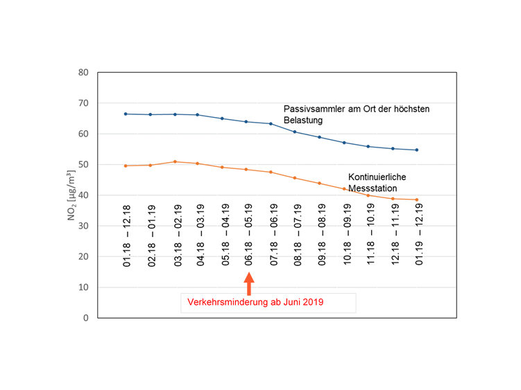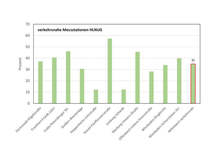 Der NO2-Jahresgrenzwert von 40 Mikrogramm pro Kubikmeter wurde in der Hügelstraße in Darmstadt über viele Jahre stark überschritten. Daher gilt seit Juni 2019 im Einklang mit dem Luftreinhalteplan unter anderem ein streckenbezogenes Dieselfahrverbot, um die Verkehrsemissionen zu reduzieren. Der Jahresmittelwert ging daraufhin in 2019 im Vergleich zum Vorjahr um zwölf Mikrogramm pro Kubikmeter und damit um über 20 Prozent. Das war der mit Abstand stärkste Rückgang in Hessen.