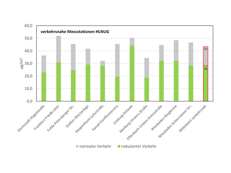 Der Corona-Effekt wird sich mit Sicherheit positiv auf den Jahresmittelwert 2020 auswirken und den ohnehin rückläufigen Trend der letzten Jahre noch einmal verstärken. Allerdings nahm der Verkehr nach dem Lockdown langsam wieder zu und befindet sich seit Anfang Juni 2020 wieder auf normalem Niveau. Dass die NO2-Werte trotzdem deutlich geringer als vor dem Lockdown ausfielen, liegt am typischen Jahresgang mit niedrigeren Werten im Sommer und höheren im Winter. Seit August steigen die Konzentrationen an fast allen Stationen wieder an. Daher ist zu erwarten, dass der EU-Grenzwert von 40 Mikrogramm pro Kubikmeter an einigen hessischen Messstellen auch 2020 wieder überschritten wird.