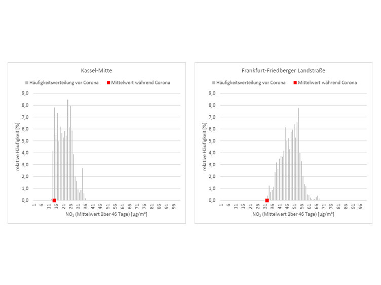 Weniger Verkehr auf den Straßen, Flugzeuge am Boden – die Corona-Krise beeinflusst auch die Luftqualität in Hessen. Nachdem die Hessische Landesregierung am 13. März 2020 die Maßnahmen zur Eindämmung der Pandemie beschlossen hatte und die Bürger weitgehend zu Hause geblieben sind, hatte der Straßenverkehr in den Großstädten zwischenzeitlich im Mittel um etwa 30 bis 40 Prozent abgenommen – und auch die Belastung mit Stickstoffdioxid (NO2) ist nachweislich gesunken.