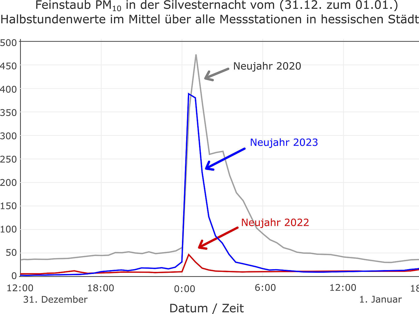Die Abbildung zeigt den Verlauf der Feinstaub PM10-Konzentration in den Silvesternächten gemittelt über alle Messstationen in hessischen Städten, zeitlich hochaufgelöst als Halbstundenmittelwerte. Zum einen ist der Verlauf gemittelt über den Jahreswechsel 2019/2020 dargestellt, also in der Zeit vor dem Verkaufsverbot von Feuerwerk. Dem gegenübergestellt ist der Verlauf der Konzentrationen zum Jahreswechsel von 2021 auf 2022 und dem aktuellen Jahr zu sehen. Im Jahr 2020 ist ein extrem starker Anstieg der Feinstaubkonzentration kurz nach Mitternacht zu erkennen. Neujahr 2022 fiel dieser Anstieg jedoch sehr viel geringer aus. In diesem Jahr liegt die Konzentration kurz nach Mitternacht wieder deutlich höher und sinkt im Anschluss vergleichsweise stark ab.