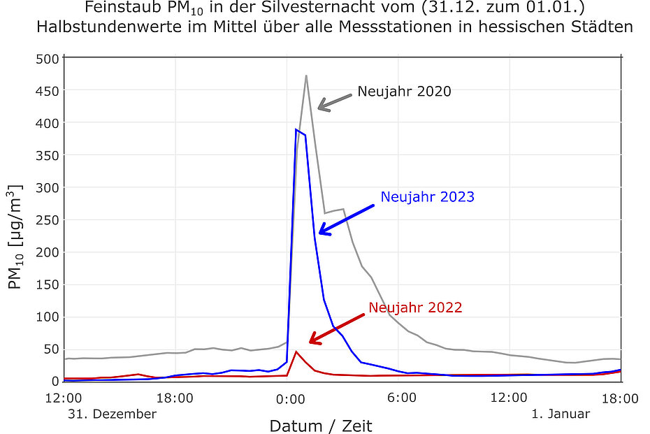Wegen des Feuerwerks in der Silvesternacht startet das neue Jahr jedoch an vielen Messstationen meist direkt mit einer sehr hohen Feinstaubbelastung. Die PM10-Halbstundenwerte können dann durchaus einige 100 µg/m3 und in Extremfällen auch bis zu 1.000 µg/m3 und darüber erreichen. In der Regel beschränken sich diese hohen Werte auf die ersten ein bis zwei Stunden des neuen Jahres. Danach fallen die Konzentrationen in der Nacht und am Morgen wieder stark ab. Auch wenn sich die wirklich hohen Konzentrationen nur auf einen sehr kurzen Zeitraum beschränken, wird der Tagesmittelwert häufig doch so stark beeinflusst, dass die kritische Schwelle von 50 µg/m3 überschritten wird.