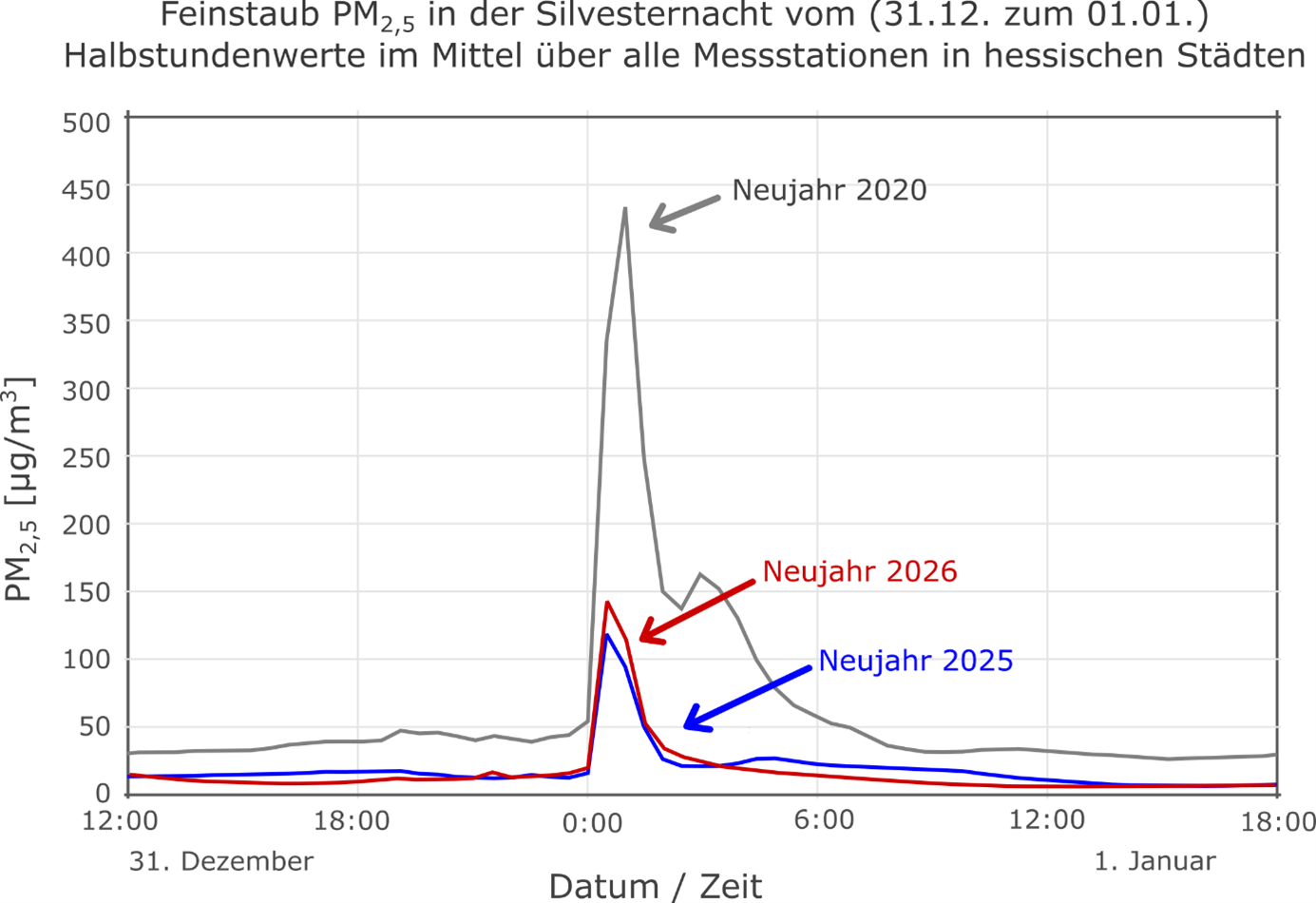 Wiesbaden, 2. Januar 2026 – Auch in diesem Jahr führte das Silvesterfeuerwerk vielerorts kurzfristig zu sehr hohen Feinstaub-Konzentrationen (PM10 und PM2,5). Das windige Wetter sorgte aber, wie in den beiden Vorjahren, für eine schnelle Verbesserung der Luftqualität. Der traditionelle Anstieg der Feinstaubkonzentration kurz nach Mitternacht fiel nur etwas höher als im Vorjahr und vergleichsweise niedrig aus. Im Mittel über alle städtischen Stationen wurde im Zeitraum von 0:00 bis 0:30 Uhr des Neujahrstags für PM2,5 eine Konzentration von etwa 140 Mikrogramm pro Kubikmeter (µg/m3) erreicht. Kurzfristig wurden jedoch an einzelnen Messstellen Werte von einigen hundert Mikrogramm pro Kubikmeter überschritten. Die höchsten Halbstundenwerte wurden mit etwa 310 bis 330 Mikrogramm pro Kubikmeter an den Messstationen in Wiesbaden Süd, der Friedberger Landstraße in Frankfurt und in Offenbach an der Unteren Grenzstraße gemessen. Aufgrund des schnellen Konzentrationsabfalls noch während der frühen Nachtstunden wurde an keiner der hessischen Messstellen für PM2,5 ein Wert von 25 µg/m3 im Tagesmittel überschritten.