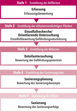 Altflächen werden aufgrund einer flächendeckenden systematischen Suche oder als Einzelfall ermittelt. Die von ihnen ausgehenden Gefahren oder Risiken werden in einem mehrstufigen Prozess erkundet und bewertet.