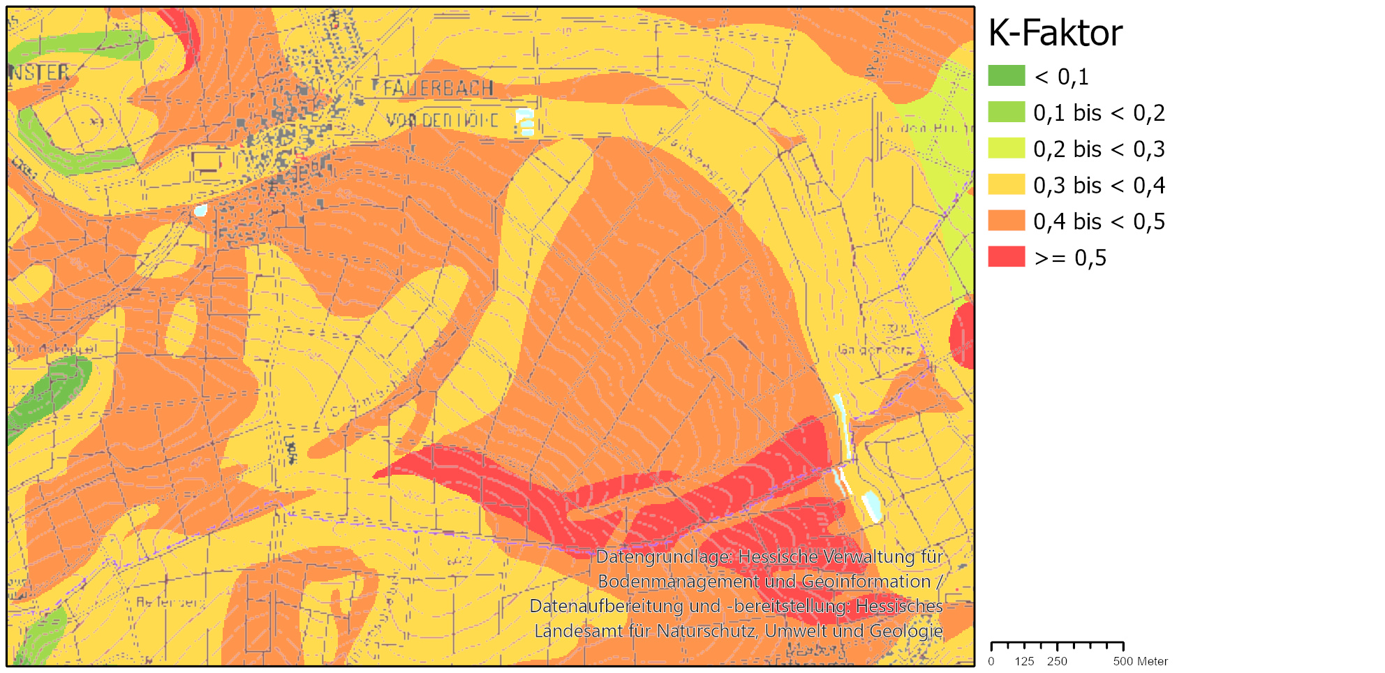 Als Datengrundlage zur Berechnung des K-Faktors werden die flächendeckend vorliegenden Bodenflächendaten 1:50.000 (BFD50, 2. Aufl.; HLNUG 2018) eingesetzt. Für jede Bodenflächeneinheit stehen hier Angaben zur Bodenart, Humus- und Grobbodengehaltsklasse zur Verfügung, die wie folgt nach den Kennwerttabellen und Formeln der DIN 19708 (2022) eingestuft werden. Unabhängig von der beschriebenen Bodennutzung wird für die Bodeneinheiten das Leitprofil für ackerbauliche Bodennutzung für die Berechnung des K-Faktors verwendet. Wenn dieses nicht vorhanden ist, wird das Leitprofil für Grünlandnutzung verwendet, wenn auch dieses nicht vorhanden ist, das Leitprofil für Waldnutzung.