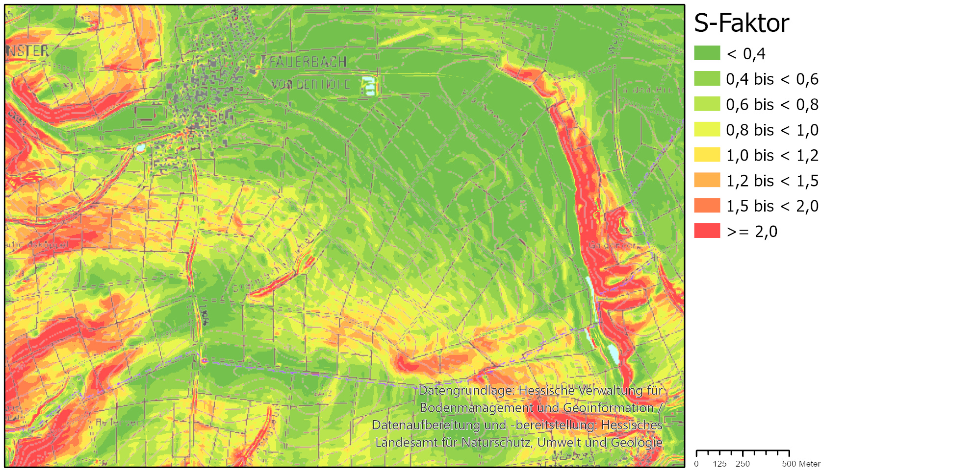 Die Berechnung des S-Faktors erfolgt nach DIN 19708 (2022). Eingangsgröße ist die Hangneigung (α in Grad), die aus dem DGM5-F abgeleitet wurde.