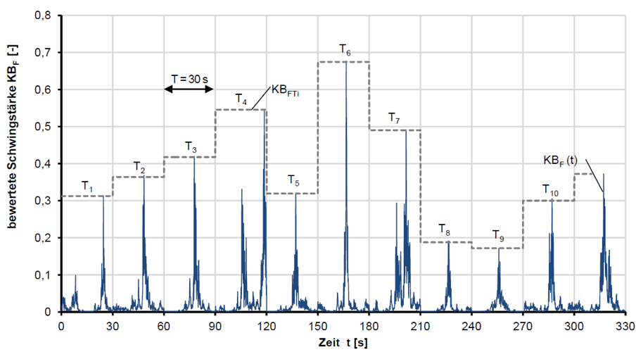Für die Beurteilung der Einwirkungen auf den Menschen in Gebäuden werden die bewerteten Schwinggrößen KBFTi der jeweiligen Teilabschnitte erfasst. Hierbei handelt es sich um jeweils den größten Wert, der in einem Zeitfenster von 30 s auftritt. In Abbildung 1 ist die Ermittlung der KBFTi-Werte dargestellt. Der Taktmaximal-Effektivwert KBFTm ergibt sich nach der nachfolgenden Gleichung, wobei N die Anzahl der Takte von jeweils 30 s darstellt. Werte für KBFTI ≤ 0,1 werden dabei mit dem Wert 0 ersetzt, da diese Erschütterungen in der Regel nicht wahrnehmbar sind.