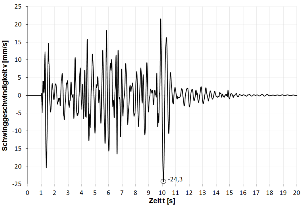 Als Messgröße zur Beurteilung der Erschütterungseinwirkungen auf bauliche Anlagen wird der Betrag der höchsten unbewerteten Schwinggeschwindigkeit vmax herangezogen. Bei kurzzeitigen Erschütterungen muss zusätzlich die maßgebliche Frequenz bestimmt werden. In Abbildung 2 ist die Schwinggeschwindigkeit v in [mm/s] über die Zeit t [s] aufgetragen. Die zur Beurteilung heranzuziehende Größe vmax beträgt im dargestellten Beispiel den Betragswert von -24,3mm/s (siehe Abbildung 2).
