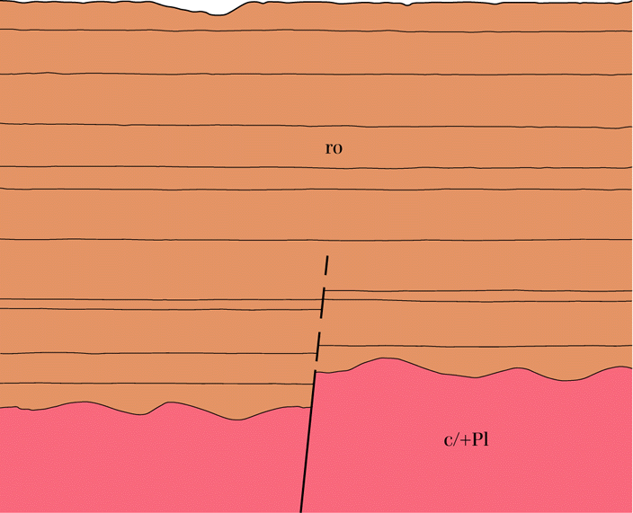 Gegen Ende des Rotliegend (unteres Perm) ist das variskische Grundgebirge, das bei Groß-Zimmern und Offenthal überwiegend aus karbonzeitlichen Graniten, Granodioriten und ähnlichen Plutoniten (c/+Pl) besteht, weitgehend eingeebnet. Alte, während der variskischen Faltung gegen Ende des Karbons angelegte Störungszonen werden von permzeitlichen Schuttsedimenten (ro) überdeckt.