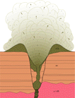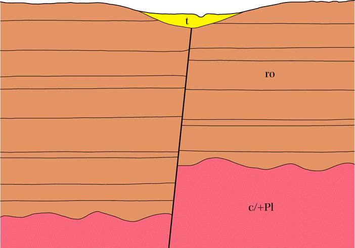 Auf den tief im Grundgebirge wurzelnden Störungszonen dringt im Grenzbereich Unter-/Mitteleozän Magma (M) auf. Im Kontaktbereich der heißen Gesteinsschmelze mit dem Grundwasser werden Wasserdampfexplosionen ausgelöst. Es entstehen Maare. Gegen Ende der Eruptionen haben sich - wie hier dargestellt - in der Umrandung der Explosionstrichter Tuffwälle (+VT) aus vulkanischen Auswurfprodukten (Asche, Nebengesteinsbrocken usw.) gebildet. Schollen aus Gesteinen der Kraterumrandungen brechen über den Explosionshohlräumen ein.