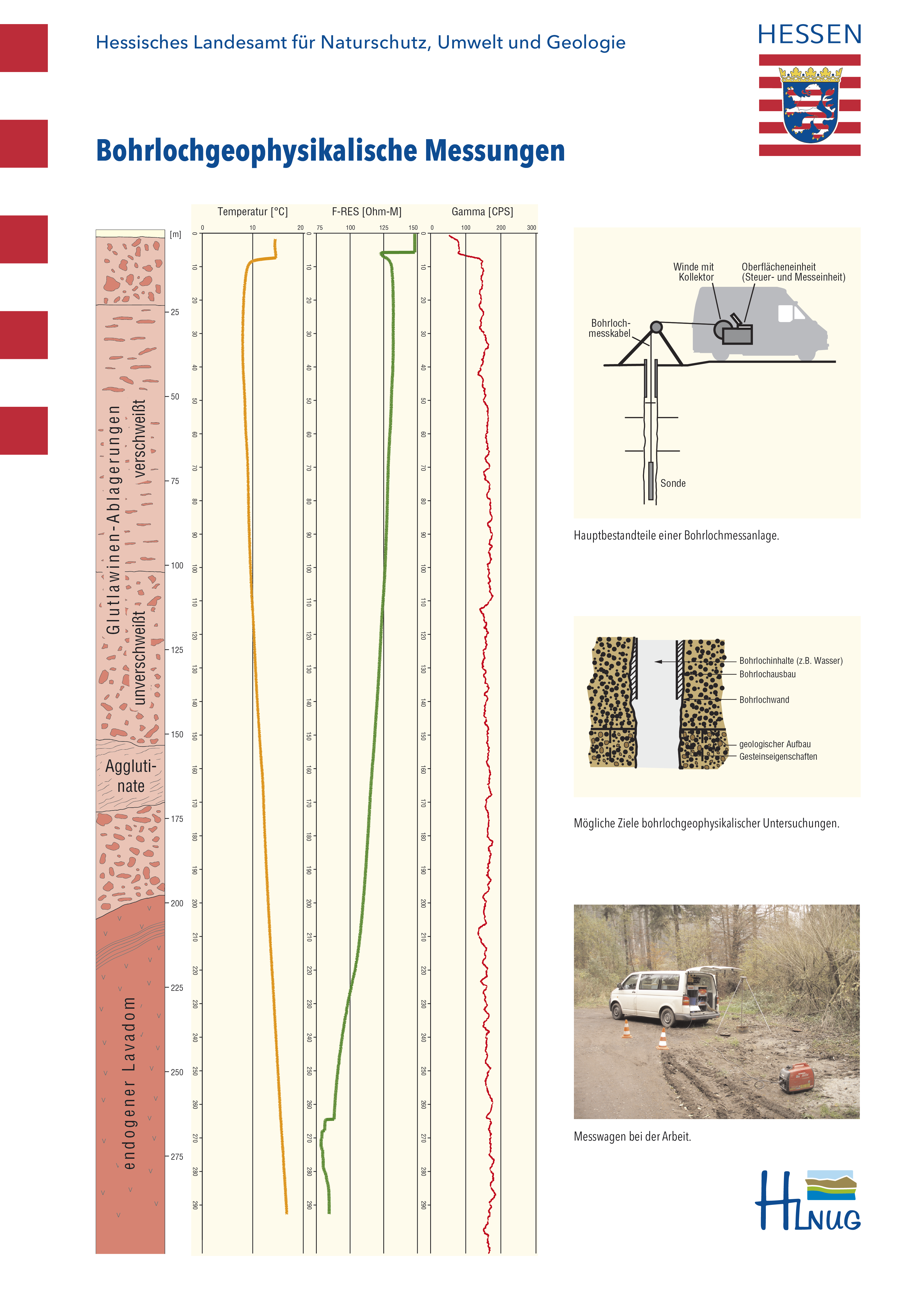Neben Messungen an der Erdoberfläche können mit speziellen Messsonden physikalische Parameter in Bohrlöchern beobachtet werden. Am HLNUG gibt es hierfür eine Multisonde mit drei Aufnehmern in einem Gehäuse, die an einem Messkabel mit einer elektrischen Winde bis zu 500 m tief kontinuierlich Messwerte aufzeichnen kann. Beobachtet werden mit dieser Apparatur die natürliche Gammastrahlung, die Temperatur und die elektrische Leitfähigkeit, bzw. ihr Kehrwert, der elektrische Widerstand.