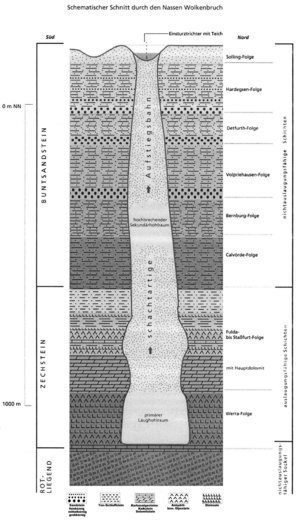 In der jüngsten erdgeschichtlichen Vergangenheit schließlich erreichte frisches, das heißt unversalzenes und daher hoch lösungsfähiges Grundwasser über die bei der Hebung entstandenen Trennflächen unter anderem auch die Sulfat- und Salzgesteine des Zechsteins im Untergrund. Diese wurden dabei örtlich aufgelöst und mit dem Grundwasser abgeführt. Dadurch wurden in einer Tiefe zwischen 900 m und 1300 m zunächst Laug-, Lösungs- oder auch Primärhohlräume geschaffen. Der Karst-Hohlraum unterhalb des Großen Wolkenbruches muss ein Ausmaß von etwa 880 000 Kubikmetern erreicht haben, bevor die darüber liegenden Buntsandstein-Schichten in jüngster geologischer Vergangenheit (Quartär) kollabierten und der vorliegende Einsturztrichter von etwa 325 000 Kubikmetern Rauminhalt entstand. Damit entstand auf mechanischem Wege ein Sekundärhohlraum, der daraufhin die Buntsandstein-Schichten in einer schachtartigen Aufstiegsbahn nach oben durchwanderte bis schließlich in historischer Zeit an der Erdoberfläche ein Einsturztrichter, Erdfall oder auch Doline genannt, einbrechen konnte. Der direkte Untergrund der Erdfälle besteht aus einer so genannten Subrosionsbrekzie, also aus Blöcken und Schutt des in die Tiefe gerissenen Gesteinsmaterials.