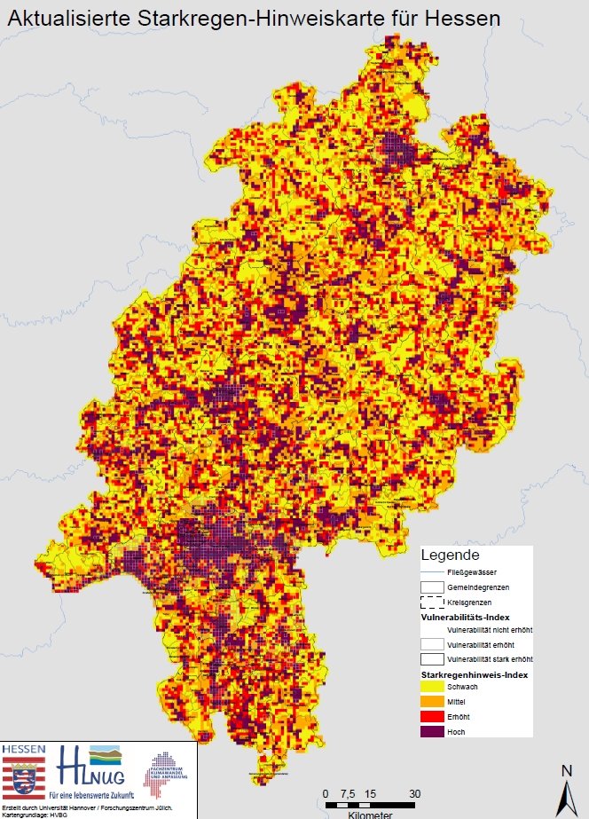 Die Berücksichtigung der zusätzlichen vier Jahre führt dazu, dass sich die Zellen ohne registrierte Ereignisse merklich verringern. Die Anzahl der Ereignisse pro Rasterzelle nehmen hingegen stark zu. Zudem wurde in der Überarbeitung die Besiedelung etwas stärker gewichtet als zuvor. In der aktualisierten Starkregen-Hinweiskarte 2022 treten dadurch die Siedlungsflächen stärker als bislang hervor. Die höchsten Werte werden in Kassel, im Rhein-Main-Gebiet , Gießen und Darmstadt erreicht. Aber auch innerhalb des ländlichen Raums heben sich die Siedlungen eindeutiger als bislang vom schwach versiegelten Umland ab. Die in Hessen oft dicht besiedelten Flusstäler, in denen es regelmäßig zu Überflutungen kommt, treten in der Karte ebenfalls als Bereiche mit deutlich erhöhtem Starkregenhinweis-Index hervor.