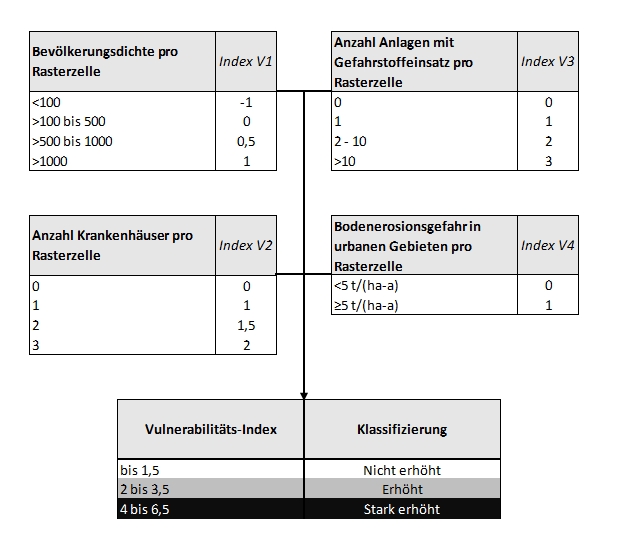 Der Vulnerabilitäts-Index (umrandete Rasterzellen in den Karten) ergibt sich aus Standortfaktoren, die räumlich variierende Schadenspotenziale, Sachwerte oder Infrastrukturen (z.B. Krankenhäuser) einbeziehen. Folgende Informationen gehen in den Index ein: