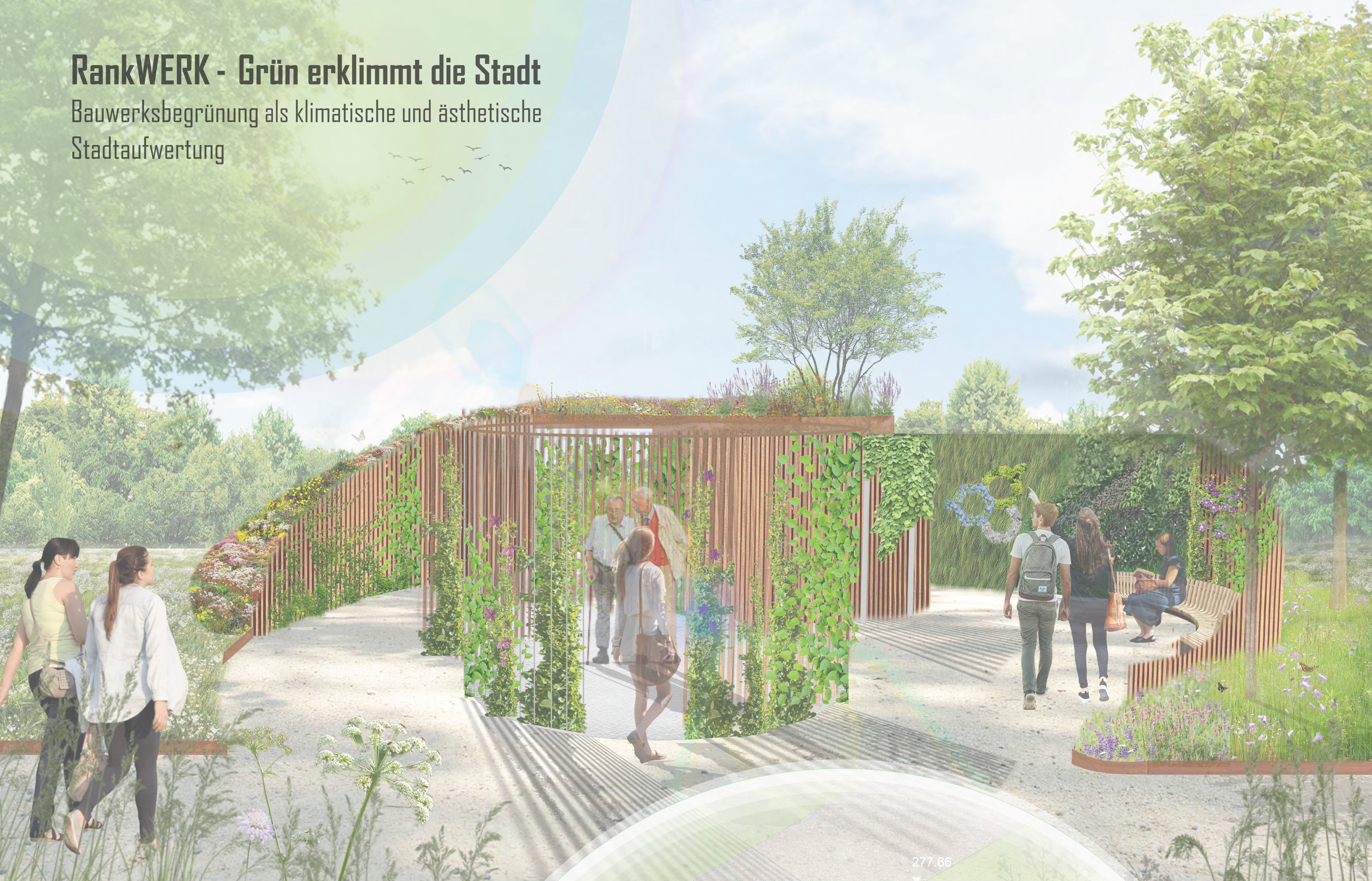 Im Rahmen eines Wettbewerbs haben Studierende der Hochschule Geisenheim University für das Projekt KLIMPRAX Stadtgrün einen Themengarten zur Bauwerksbegrünung entworfen. Den Gästen der Landesgartenschau wurde so das Thema Dach- und Fassadenbegrünung nahegebracht und verdeutlicht, dass diese Begrünungsmöglichkeiten einen Beitrag zur Klimaanpassung leisten können. Angepasste Pflanzenarten, Verschattungs- und Kühleffekte oder Regenwasserrückhalt tragen dazu bei, dass städtisches Grün den zukünftigen Bedingungen gewachsen ist und das Stadtklima verbessert.