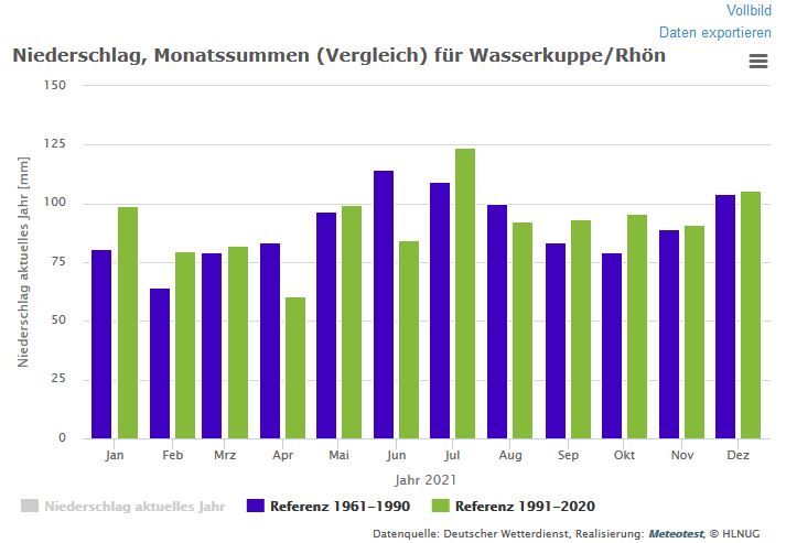 Die Abbildung zeigt einen Vergleich der monatlichen mittleren Niederschlagsmengen des Referenzzeitraumes 1961–1990 (dunkelblau) mit dem des Zeitraumes 1991-2020 (grün) für Hessens höchsten Berg, die Wasserkuppe. Diese Mittelwerte werden zur Bewertung der aktuellen Niederschlagsmengen herangezogen. Bei größeren Veränderungen der langjährigen Monatsmittelwerte können daraus veränderte Bewertungen eines Monats resultieren. So ist die Niederschlagssumme beispielsweise in April und Juni zwischen den beiden gezeigten Zeiträumen um mehr als 25 % zurückgegangen, während sie in Januar und Oktober um über 20 % angestiegen ist. Diese Veränderungen können dazu führen, dass derselbe Monat im Vergleich zum einen Datensatz z.B. als 10 % zu nass und im Vergleich zum anderen Datensatz als 10 % zu trocken bewertet wird. Das hier aufgezeigte Prinzip ist für alle Niederschlagsmessstellen in Hessen relevant, fällt je nach Standort allerdings räumlich und zeitlich unterschiedlich aus.