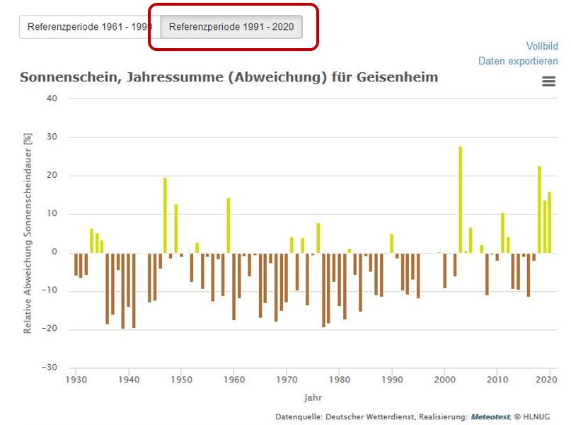 Die beiden Abbildungen zeigen die Abweichung der jährlichen Summe der Sonnenscheindauer der Klimastation Geisenheim vom jeweils gewählten Referenzzeitraum. Die Säulen zeigen die Abweichung der Anzahl der Sonnenstunden eines Jahres von der gewählten Referenzperiode. Ist die Säule nach unten gerichtet, war das Jahr bewölkter als die Norm, ist die Säule nach oben gerichtet, war das Jahr sonniger. Bei identischer Datengrundlage ergeben sich durch den gewählten Referenzzeitraum unterschiedliche Bewertungen sowohl der Gesamtreihe (siehe Abbildungsbeschriftungen) als auch der Einzeljahre. Während z.B. im Vergleich zum Referenzzeitraum 1961-1990 15 der vergangenen 20 Jahre sonniger als im Durchschnitt (≥ 5 %) waren, so liegt deren Zahl bei Verwendung der Referenzperiode 1961-1990 mit fünf deutlich niedriger. Diese Aussagen gelten in ähnlicher Form für alle Klimastationen in Hessen, wenngleich der Unterschied beider Referenzperioden an manchen Stationen weniger deutlich als in Geisenheim ausfällt.