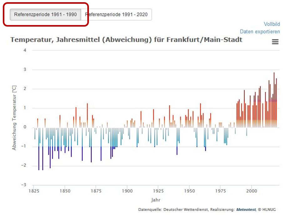 Bei identischer Datengrundlage ergeben sich sehr unterschiedliche Bewertungen sowohl der Gesamtreihe (siehe Abbildungsbeschriftungen) als auch der Einzeljahre. Während z.B. das Jahr 2016 gegenüber der aktuellen Referenzperiode 1991-2020 als "normal" eingestuft wird, gilt es im Vergleich zur Referenzperiode 1961-1990 als "extrem warm". Gleichzeitig war das Jahr 2010 bei Zugrundelegung dieser Vergleichsperiode "normal", während es gegenüber 1991-2020 "extrem kalt" war. Diese Aussagen gelten in ähnlicher Form für alle Klimastationen in Hessen.