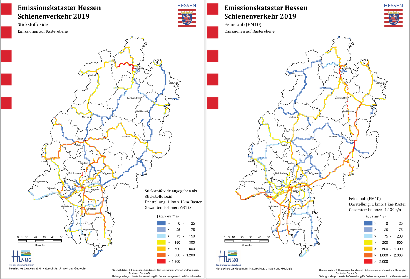 Das HLNUG fragt die so berechneten Emissionen für einzelne Jahrgänge bei der DB AG an. Bei den bereitgestellten Rohdaten handelt es sich um Emissionssummen für Streckenabschnitte von unterschiedlicher Länge (einige hundert Meter bis mehrere Kilometer). Diese werden für das Emissionskataster Hessen weiterverarbeitet. Dabei wird pro Schadstoff die Summe der Emissionen für Hessen, auf Ebene der Kreise, der Gemeinden sowie für ein 1 km x 1 km-Rasternetz berechnet.
