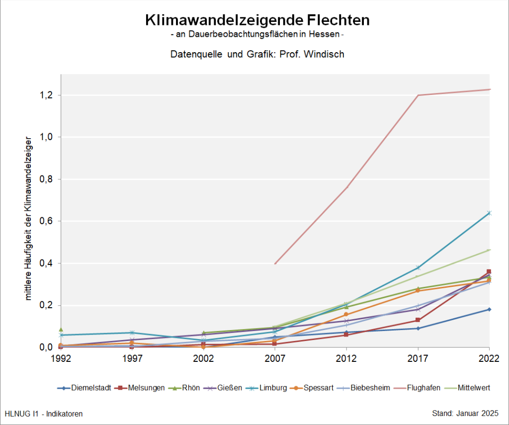 Von 1992 bis 2002 wurden in Hessen an den untersuchten Bäumen nur selten Flechtenarten gefunden, die als Klimawandelzeiger gelten. Im Untersuchungsjahr 2007 konnte ein Anstieg sowohl der Artenzahl der Klimawandelzeiger als auch deren Häufigkeit dokumentiert werden, der sich bis 2022 deutlich weiter verstärkt hat. Dabei ist folgendes räumliches Muster zu erkennen: Während auf der nordwesthessischen Untersuchungsfläche Diemelstadt Klimawandelzeiger bis heute noch selten anzutreffen sind, ist in der südlichen Landeshälfte in den vergangenen zehn Jahren ein Wandel eingetreten. Die Häufigkeit der Klimawandelzeiger hat sich dort an allen untersuchten Flächen erhöht. Besonders interessant ist das Gebiet um den Frankfurter Flughafen, das mit Biebesheim zu den wärmsten und niederschlagsärmsten der untersuchten Dauerbeobachtungsflächen in Hessen gehört. Die Ergebnisse deuten darauf hin, dass sich Verschiebungen im Artenspektrum der Flechten zeigen.