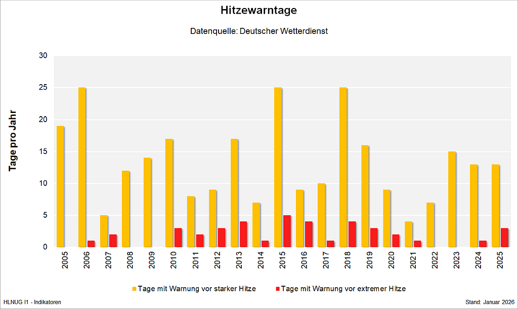 Der Indikator Hitzewarntage gibt die Anzahl an Tagen pro Jahr an, an denen der Deutsche Wetterdienst (DWD) für mindestens einen Landkreis Hessens Hitzewarnungen ausspricht. Dabei werden Warnungen vor Tagen mit starker und extremer Wärmebelastung differenziert betrachtet.