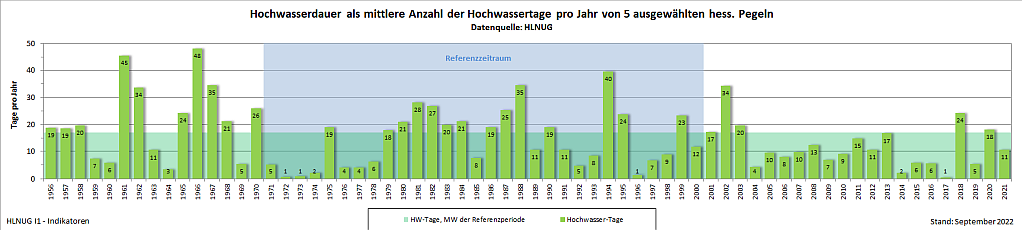 Man erhält so einen repräsentativen Mittelwert für die Anzahl der Hochwassertage und damit für die Hochwasserdauer für jedes betrachtete Jahr in Hessen. Dieser kann mit dem Referenzwert verglichen werden.