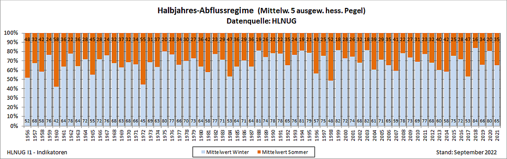 Man erhält so eine auf 100 % bezogene Verhältniszahl für den mittleren Sommerabfluss und den mittleren Winterabfluss pro Jahr, repräsentativ für ganz Hessen.