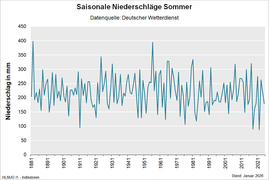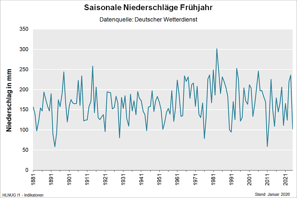 Die jährliche Niederschlagsmenge in Hessen für den Zeitraum 1881-1910 betrug 713 mm, für den Zeitraum 1996-2025 stieg diese um 46 mm auf 759 mm an. Für den Sommer war über die gleichen Zeiträume keine erhebliche Veränderung zu erkennen, wohingegen für den Winter eine Zunahme der Niederschlagsmenge zu verzeichnen war.