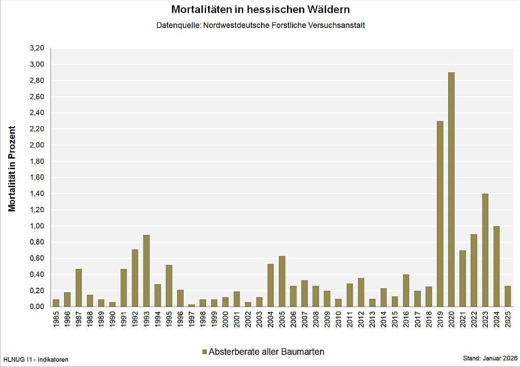 Die Grafik zeigt die jährliche Absterberate aller Baumarten in den hessischen Wäldern in Prozent. Ein starker Anstieg der Mortalität zeigt sich besonders in den Folgejahren nach heißen und trockenen Sommern. So finden sich die bisher höchsten Absterberaten seit Beginn der Erfassung als Folge der Extremjahre 2018 bis 2020. In den vergangenen 5 Jahren wurden solche Werte nicht mehr erreicht. Nach einem erneuten Anstieg im Jahr 2023 auf 1,4 % ist der Wert in 2025 erstmals seit 7 Jahren mit 0,26 % wieder unter das langjährige Mittel von 0,45 % gesunken.
