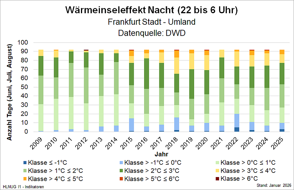 Die Ausbildung einer städtischen Wärmeinsel (Urban Heat Island = UHI) beschreibt das Phänomen, dass sich innerhalb von Städten Wärme- und Hitzebelastungen unterschiedlich stark bemerkbar machen und Städte im allgemeinen stärker betroffen sind als das unbebaute Umland. Je mehr Fläche die Städte beanspruchen und je dichter sie bebaut sind, desto größer fällt der Wärmeinseleffekt typischerweise aus. Die Darstellung als Indikator veranschaulicht diesen Effekt, hier am Beispiel der größten hessischen Stadt Frankfurt am Main (ca. 750.000 Einwohner). Infolge des Klimawandels steigen die Temperaturen in Hessen ganzjährig an. Für die menschliche Gesundheit ist die zusätzlich noch verstärkte Aufheizung der Stadt vor allem in den warmen Sommermonaten relevant. Insbesondere die mangelnde nächtliche Abkühlung ist dabei von großer Bedeutung. Zwar ist die Ausprägung einer Wärmeinsel in den Innenstädten keine direkte Folge des Klimawandels, sie gewinnt jedoch mit den aufgrund des Klimawandels steigenden Temperaturen zunehmend an Bedeutung. Durch den Wärmeinseleffekt werden aber nicht nur die menschliche Gesundheit, sondern auch urbane Ökosysteme beeinflusst.