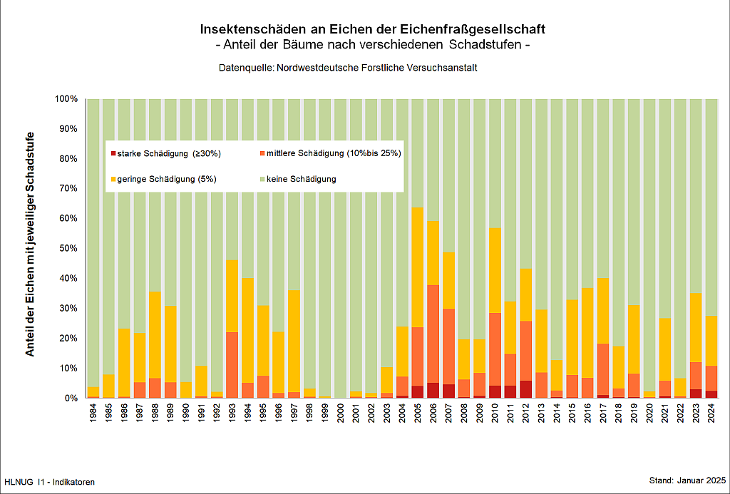 Der Indikator beschreibt die Schäden an den Eichen durch die Eichenfraßgesellschaft und wird mit der jährlichen Waldzustandserhebung der Nordwestdeutschen Forstlichen Versuchsanstalt ermittelt.