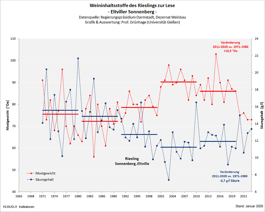 Für den Indikator werden die Gesamtsäurewerte (Weinsäure und Apfelsäure als Gramm pro Liter) und das Mostgewicht in Öchslegrade (°Oe) in den Trauben zum Zeitpunkt der Lese betrachtet. Die Daten werden für den Referenzweinberg Eltviller Sonnenberg im Rheingau herangezogen, für den lange Zeitreihen ab 1971 zur Verfügung stehen.