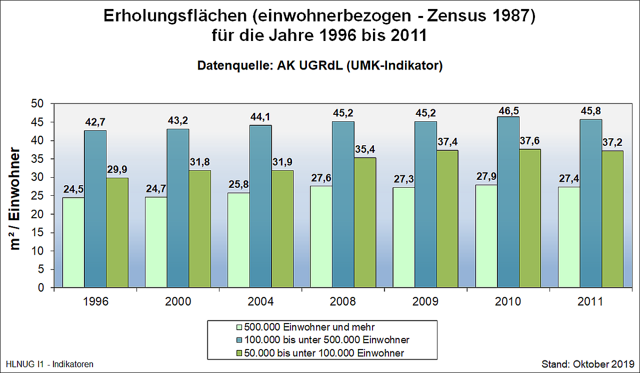 Grundlage für die Berechnung ist die länderübergreifend einheitlich geregelte Abgrenzung nach der Flächenstatistik "Bodenfläche nach Art der tatsächlichen Nutzung". Zur Berechnung des Indikators werden die Sport-, Freizeit- und Erholungsflächen sowie Friedhofsflächen erfasst (Nutzungsarten 18000 + 19000). Diese werden für die Städte nach Größenklassen erfasst und in Bezug zur Einwohnerzahl gesetzt (Bevölkerungsstand am 31.12. des Vorjahres; Bevölkerungsfortschreibung auf Basis des Zensus vom 9. Mai 2011). Die entsprechenden Flächen mit Stichtag 31.12. werden in qm/Einwohner für Städte von 50.000 bis unter 100.000 Einwohner, 100.000 bis unter 500.000 Einwohner und über 500.000 Einwohner ausgewiesen.