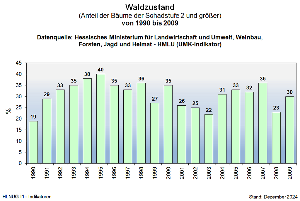 Für den Vitalitätszustand der Wälder dient der Kronenzustand als Weiser. Die Erfassung der Waldschäden basiert daher auf einer Beurteilung der Baumkronen. Als wichtigste Kriterien werden hierbei die Nadel-/Blattverluste und die Vergilbung der Blattorgane vom Boden aus eingeschätzt (terrestrische Waldschadensaufnahme). Eine Zusammenführung dieser Schadkriterien ergibt fünf so genannte Kombinationsschadstufen (0 = ungeschädigt, 1 = schwach geschädigt, 2 = mittelstark geschädigt, 3 = stark geschädigt, 4 = abgestorben). Der Waldzustand wird in Hessen seit 1984 jährlich erfasst, die Erhebung wird in einem Raster von 8 x 8 km² durchgeführt. In der von den Waldschäden besonders betroffenen Rhein-Main-Ebene erfolgt seit 1994 eine Sondererhebung im 4 x 4 km² Raster. Dargestellt wird der Anteil der deutlich geschädigten Bäume aller Baumarten der Stufe 2 und größer (Kombinationsschadstufe 2 bis 4). Eine positive Entwicklung des Indikators zeigt sich im Rückgang der deutlich geschädigten Bäume, also in einer Abnahme des Indikatorwertes.