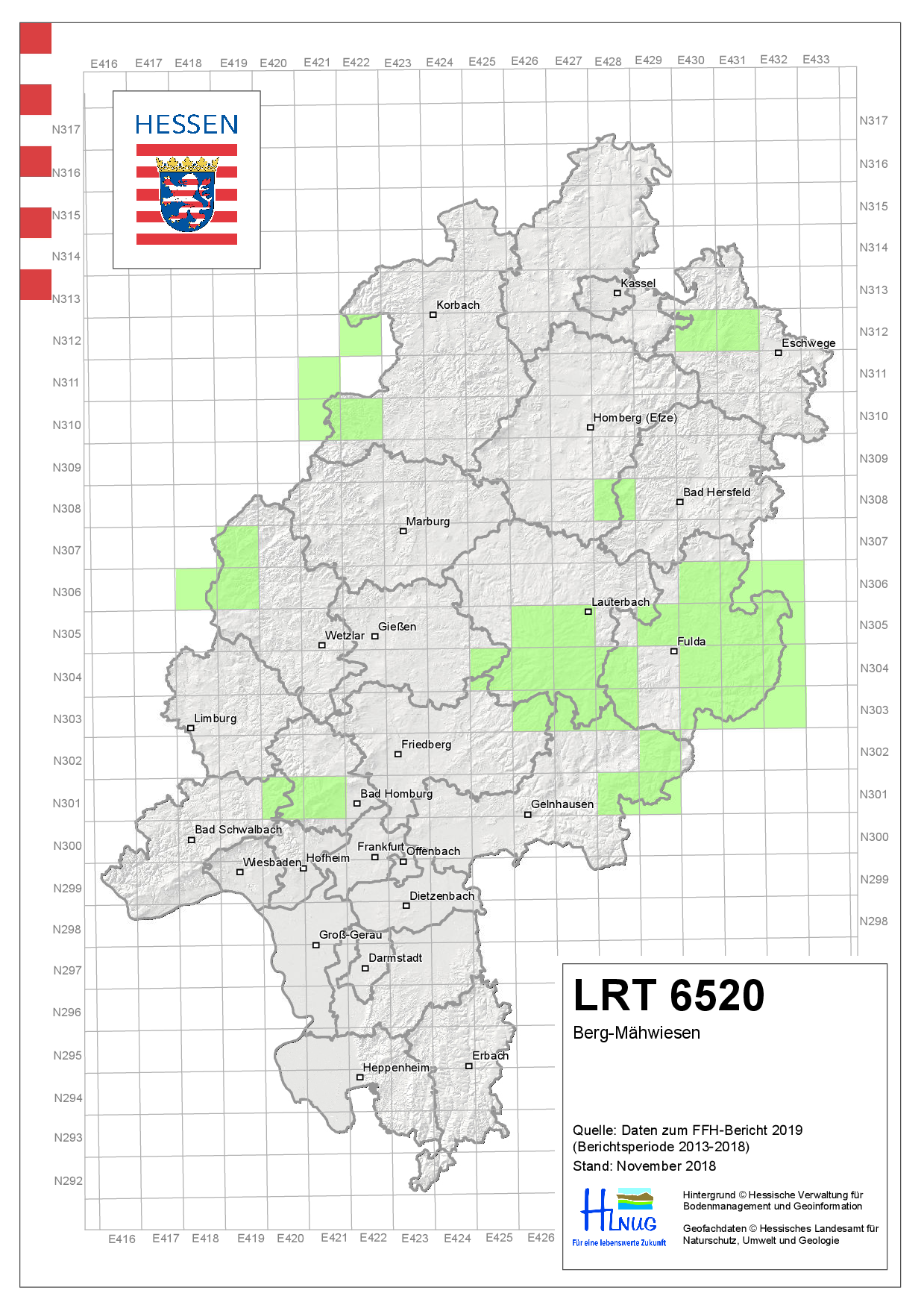 Das Hauptverbreitungsgebiet der Berg-Mähwiesen in Hessen liegt in den Höhenlagen des Osthessischen Berglandes. In der Rhön, auf dem Landrücken und im Vogelsberg befinden sich die qualitativ und quantitativ bedeutendsten Flächen, die insgesamt mehrere hundert ha umfassen. Weitere nennenswerte Bergwiesen befinden sich im Meißnergebiet, im Westerwald und im Taunus. In den übrigen Mittelgebirgslagen sind Bergwiesen nur spärlich vertreten, schlechter ausgeprägt oder fehlen ganz. Die untere Höhengrenze liegt je nach Regionalklima und Nährstoffversorgung zwischen 350 und 500 m über NN.