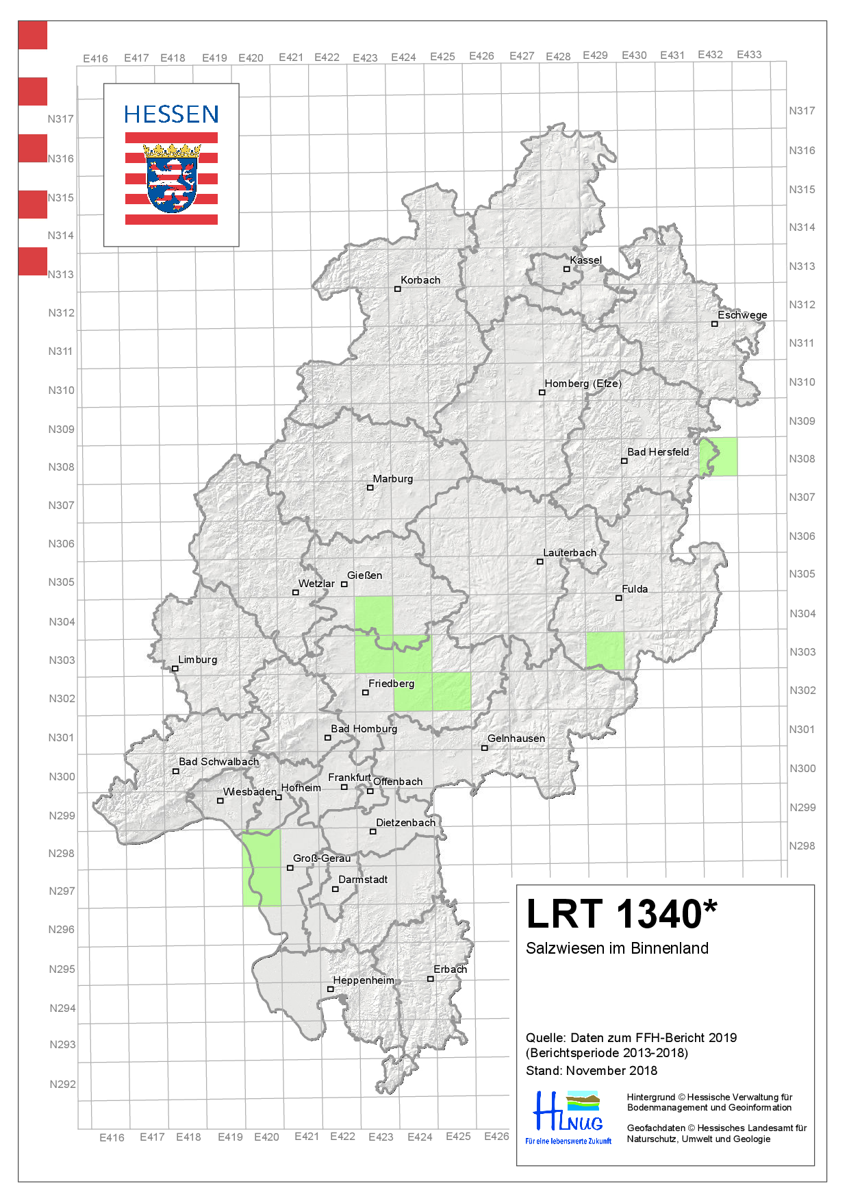 Der Lebensraumtyp umfasst natürliche Binnenlandsalzstellen mit ihren salzhaltigen Quellaustritten und ihrer Halophytenvegetation (Halophyten = an salzhaltigen Standorten vorkommende Pflanzenarten). Wo durch geologische Besonderheiten salzhaltiges Grundwasser an die Oberfläche dringt, können typische Salzpflanzen wie Strandaster (Aster tripolium), Strand-Wegerich (Plantago maritima) oder Strand-Dreizack (Triglochin maritimum) wachsen, die sonst auf die Küste beschränkt sind. Die meisten hessischen Binnenlandsalzstellen sind Grünlandflächen, die als Wiese oder Weide genutzt werden. Die Salzwiesen der primären Binnenlandsalzstellen konzentrieren sich in Hessen auf die Wetterau. Ein kleines Vorkommen liegt in der Oberrheinebene bei Trebur. Ein größeres sekundäres, d. h. künstlich entstandenes Vorkommen mit einer reichhaltigen Halophytenvegetation hat sich bei Heringen an der Werra durch Abwässer des dortigen Kalisalz-Förderbetriebes entwickelt.
