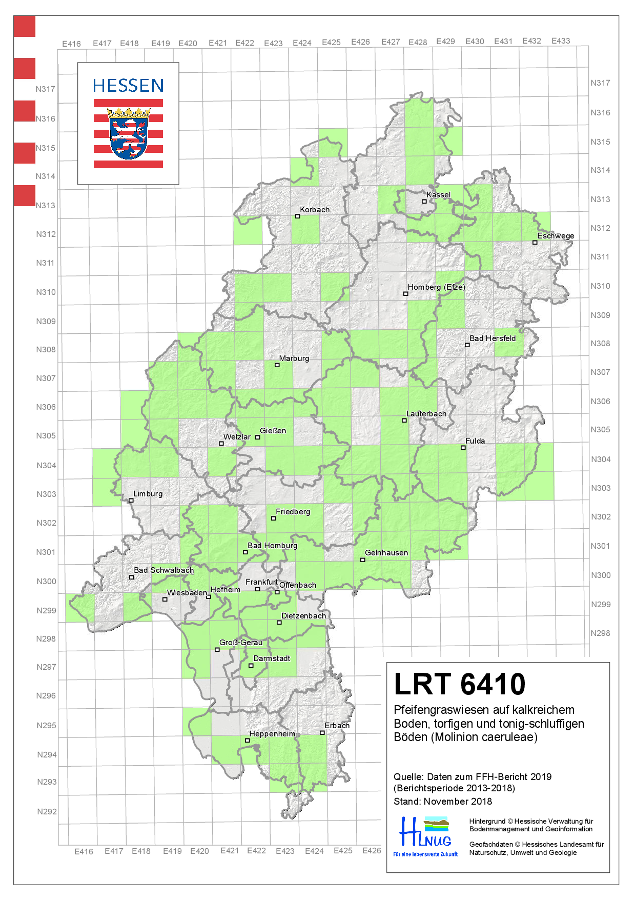 In Hessen haben die Pfeifengraswiesen ihre Hauptverbreitung in den südlichen Teilen des West- und Osthessischen Berglandes, im Westerwald mit dem Gladenbacher Bergland, in Nordhessen in der weiteren Umgebung des Meißners, am Taunusrand und im Oberrheinischen Tiefland.