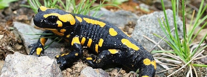 Der Europäische Feuersalamander (Salamandra salamandra) ist durch seine typische schwarz-gelbe Färbung leicht von anderen Amphibien zu unterscheiden. Dabei kann die Färbung der Tiere von Gelb über Orange bis hin zu Rot variieren. Feuersalamander sind kräftig gebaute Landsalamander und können bis zu 20 cm lang und 40 Gramm schwer werden. Der in Europa weit verbreitete Feuersalamander bewohnt vorzugsweise Laub-/ Mischwälder durchzogen von Bächen in mittleren Höhen. Bei milden Temperaturen und hoher Luftfeuchtigkeit sind die Tiere in der Dämmerung und nachts aktiv.