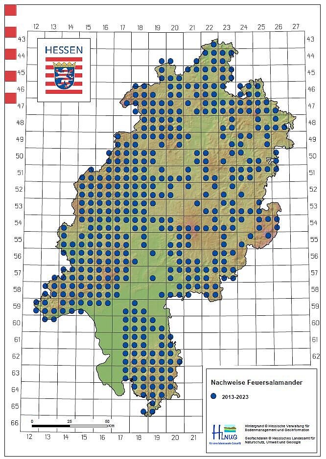 Das Artenschutzprojekt für die Populationen des Feuersalamanders (Salamandra salamandra) in Hessen: Bestandserhebung, Monitoring, Biotopentwicklung, Öffentlichkeitsarbeit, Bildung und Wissenschaftskommunikation endete im November 2025 mit einer Abschlussveranstaltung. Die Wissenschaftlerinnen und Wissenschaftler untersuchten seit 2018 die Bedrohung der Feuersalamander in Hessen durch den Hautpilz Bsal und kartierten erwachsene Tiere und Larven. Durch Hautabstriche wurden Feuersalamander auf die Hautpilzerkrankung untersucht. Zusätzlich wurden Schutzmaßnahmen erprobt und umgesetzt. Gleichzeitig wurden Ehrenamtliche durch Bildungsmaßnahmen geschult, um die Kartierungsarbeit zu unterstützen und über die Problematik in der breiten Bevölkerung aufzuklären. Gefördert wurde das Projekt durch das Hessische Landesamt für Naturschutz, Umwelt und Geologie (HLNUG) mit Mitteln aus dem Biodiversitätsfonds.
