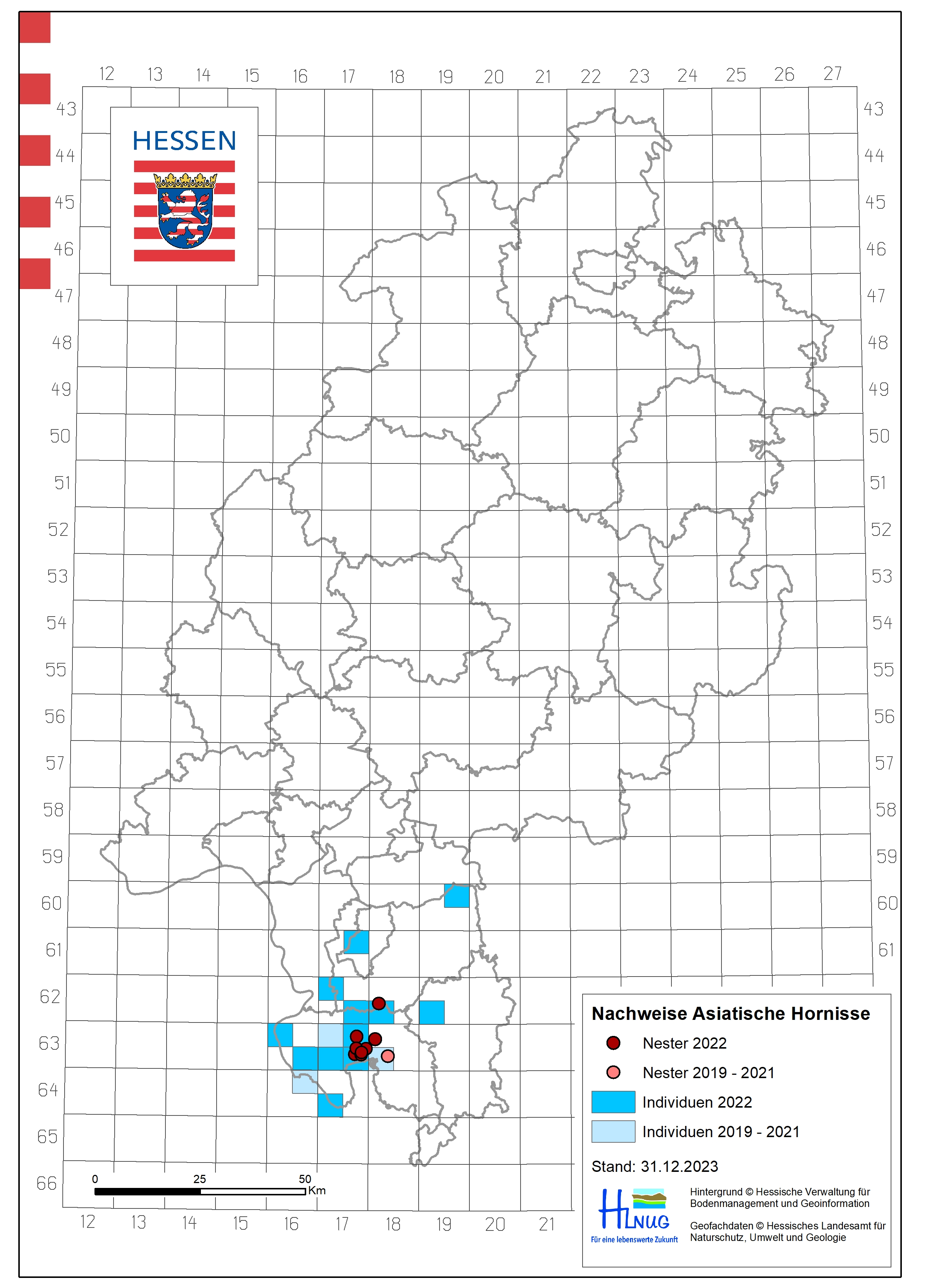Auf den Verbreitungskarten der Jahre 2019 bis 2024 ist sehr gut erkennbar, wie stark sich die Asiatische Hornisse in den vergangenen sechs Jahren in Hessen ausbreitete. Wurde die Art noch in 2021 überwiegend im Kreis Bergstraße nachgewiesen, so ist sie bereits 2023 bis in den Taunus (Rheingau-Taunus-Kreis, Hochtaunuskreis), den Lahn-Dill-Kreis, den Wetteraukreis sowie den Main-Kinzig-Kreis verbreitet. Im Vergleich zum Jahr 2023 gibt es 2024 vor allem in den Landkreisen Odenwaldkreis, Main-Taunus-Kreis und Rheingau-Taunus-Kreis eine Zunahme an Meldungen der Asiatischen Hornisse. Zudem gibt es mehrere Sichtmeldungen und drei Nestmeldungen im Regierungsbezirk Gießen. Betroffen sind die Landkreise Marburg-Biedenkopf, Limburg-Weilburg, Lahn-Dill-Kreis und Gießen.