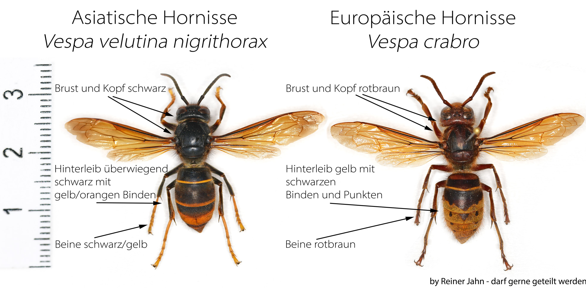 Um eine eindeutige Bestimmung für alle Interessierten zu erleichtern, zeigen wir hier drei Arten, die mit der Asiatischen Hornisse verwechselt werden können.