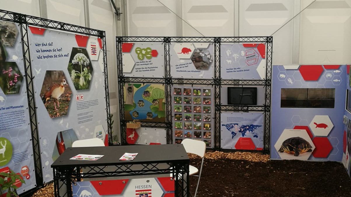 Eine Ausstellung zum Thema "Invasive, gebietsfremde Arten" wurde von der Abteilung Naturschutz des HLNUG konzipiert und kann ab Mitte Juni 2019 für Ausstellungen kostenfrei gebucht werden. Inhalte der Ausstellung sind Informationen zu invasiven gebietsfremden Tier- und Pflanzenarten in Hessen (Liste invasiver gebietsfremder Arten von unionsweiter Bedeutung gemäß Durchführungsverordnung (EU) 2016/1141 der Kommission vom 13. Juli 2016) inklusive eines Puzzles, eines digitalen Quiz und eines Films zum Thema. Zusätzlich werden zum Thema Broschüren, Steckbriefe und Faltblätter kostenfrei zur Verfügung gestellt. Die Ausstellung wird über Eck gestellt und hat eine jeweilige Seitenlänge von ca. 3 Meter und eine Höhe von ca. 2,2 Meter. Die Aquarien (siehe Foto) sind nicht Bestandteil der Wanderausstellung.
