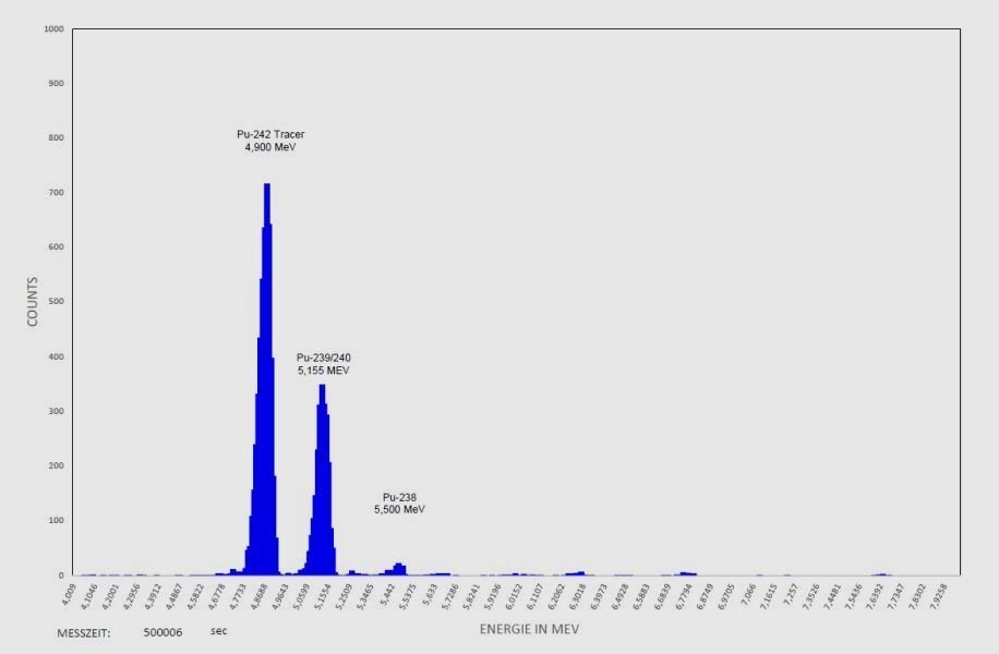 Zur Messung werden diese elektrolytisch auf einem Stahlplättchen abgeschieden. Das so hergestellte Messpräparat wird dann in einer Messkammer mittels eines Silizium-Detektors alphaspektrometrisch gemessen.