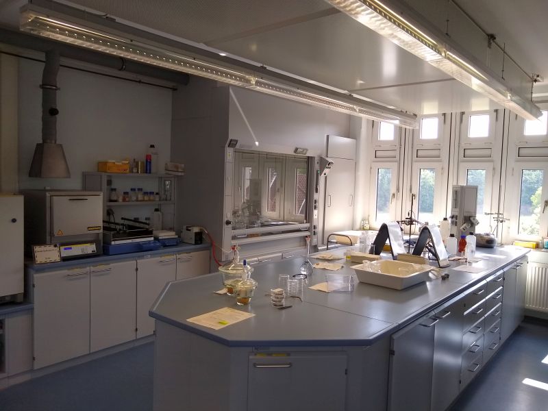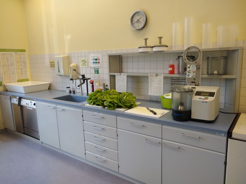 Dementsprechend verfügt der Arbeitsbereich über eine umfangreiche Ausstattung mit Trocknungs- und Veraschungsöfen, verschiedenen Mühlen und Häckslern, Rotationsverdampfern und Destillierapparaturen.