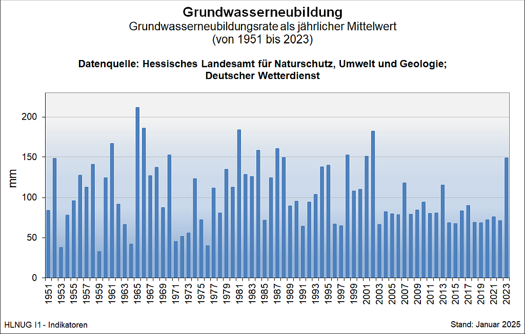 Im Rahmen des Kooperationsvorhabens KLIWA werden vom Hessischen Landesamt für Naturschutz, Umwelt und Geologie flächendifferenzierte Wasserhaushaltsmodellierungen für die Gesamtfläche des Bundeslandes Hessen durchgeführt und jährlich fortgeschrieben (KLIWA 2017). Dabei wird neben anderen Wasserhaushaltskomponenten die Grundwasserneubildung als die wesentliche Zielgröße des Verfahrens ermittelt.