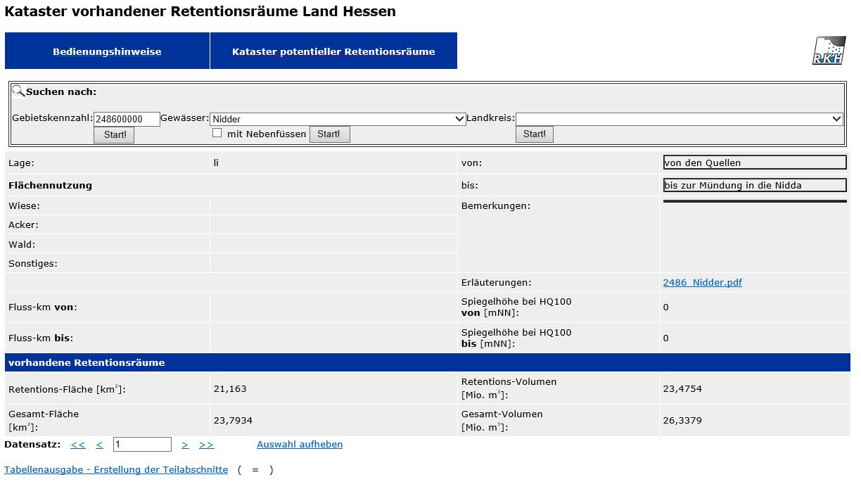 Es wird nun für die getroffene Auswahl aus dem Retentionskataster der erste Datensatz mit Angabe zu Retentionsfläche und Retentionsvolumen etc. für übergeordnete Gebiete oder einzelne Teilflächen angezeigt.
