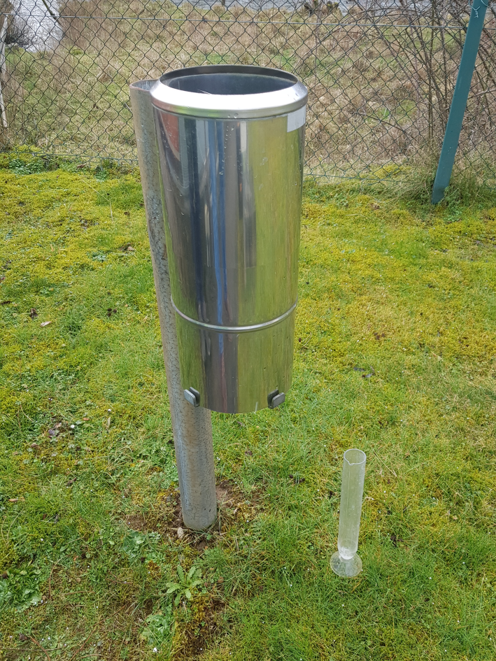 Niederschlagsmesser nach Hellmann (rechts) und ein Obrometer (links)